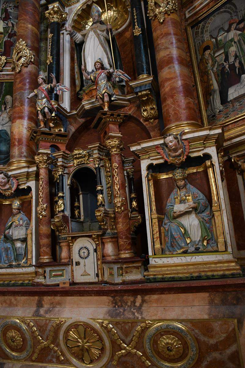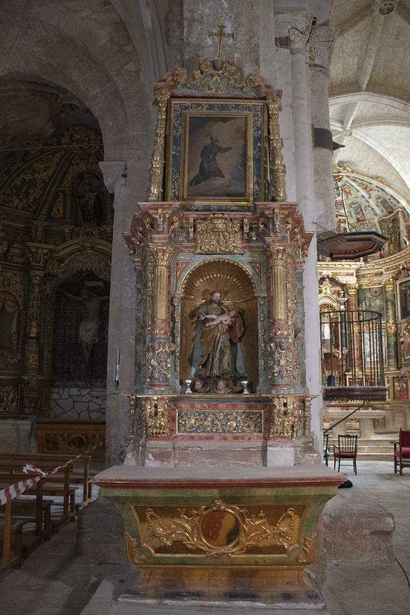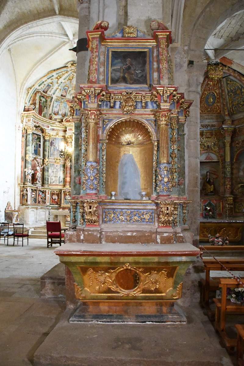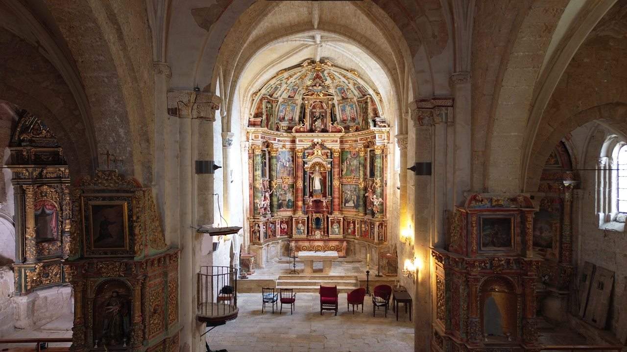 En el interior destaca la altura del templo, conseguida utilizando los arcos tardorrománicos para levantar a mayor altura las bóvedas de crucería. Destaca su retablo mayor de estilo barroco obra de José Carcedo, cuya arquitectura enmarca tablas hispano-flamencas de finales del siglo XV, obra de Alonso de Sedano, que representan la vida de San Millán de la Cogolla. Notable es también el artesonado gótico-mudéjar del coro, en el que aparecen escenas campestres y cinegéticas además de escudos y motivos vegetales. Se conservan también retablos de los siglos XVII y XVIII y la caja barroca de un órgano hoy desaparecido.