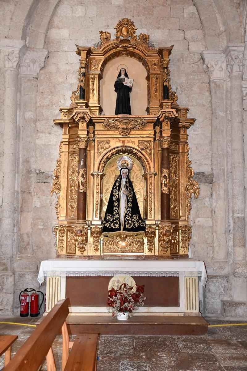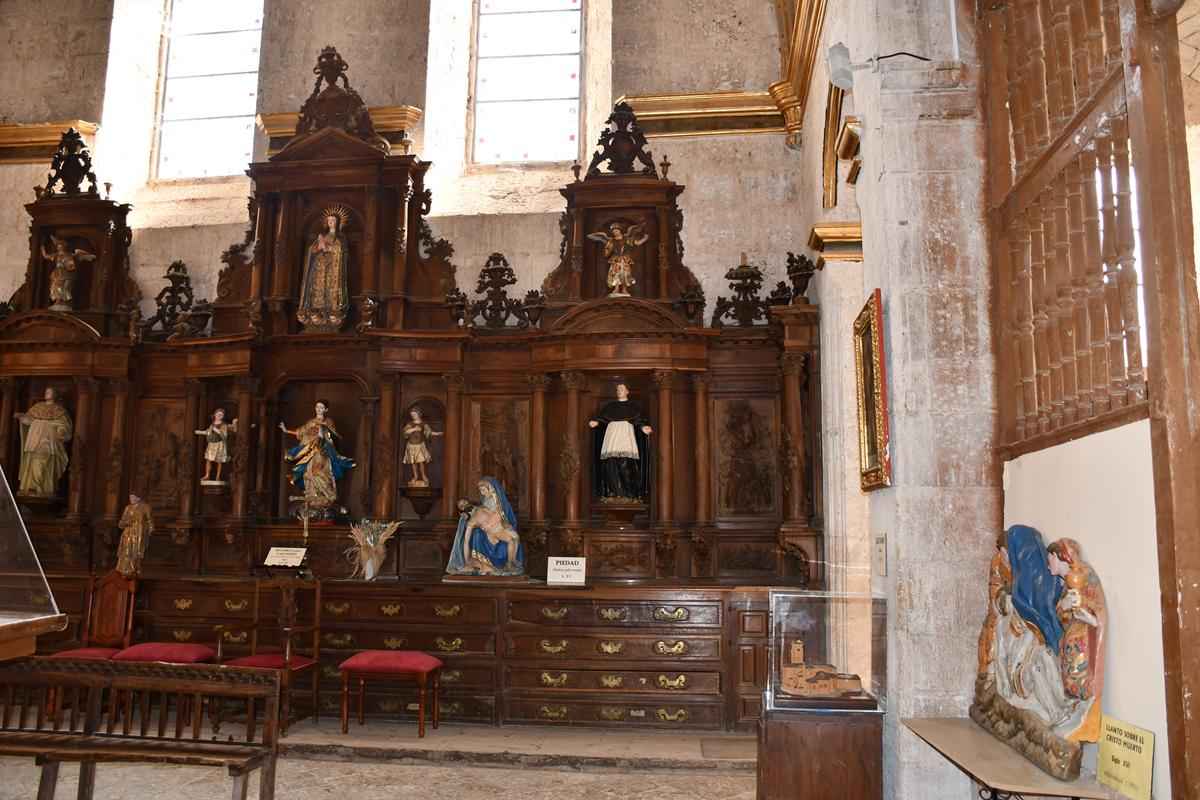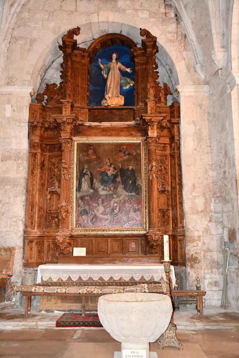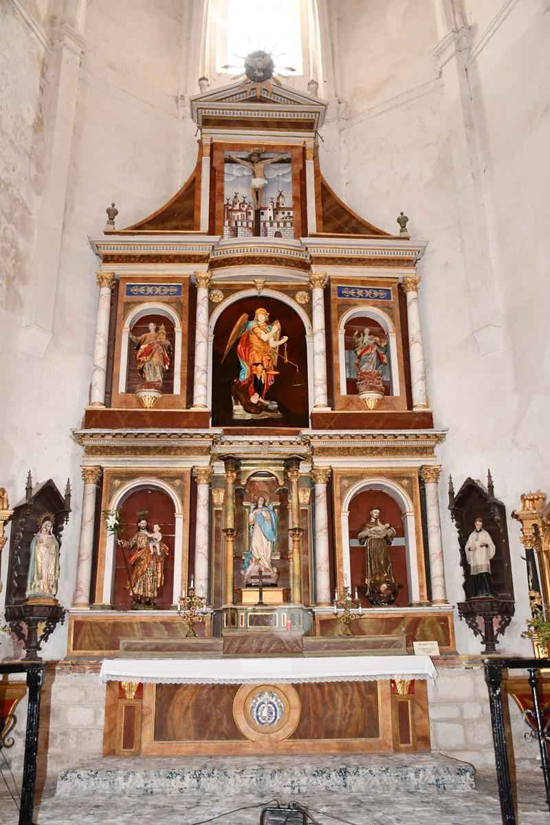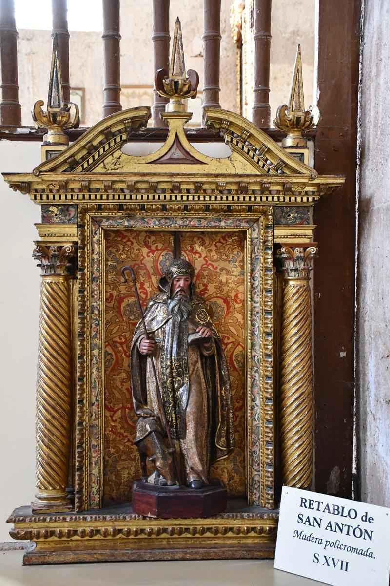 En el interior, destaca el retablo mayor neoclásico y un retablo plateresco de Santiago, en la cabecera. Sobresalen también dos pilas bautismales, una románica muy sencilla y la otra renacentista, profusamente decorada, un púlpito de piedra y restos de un retablo romanista.