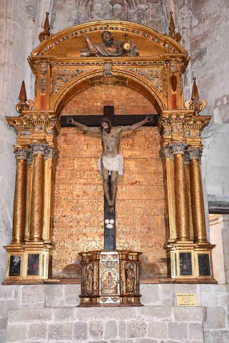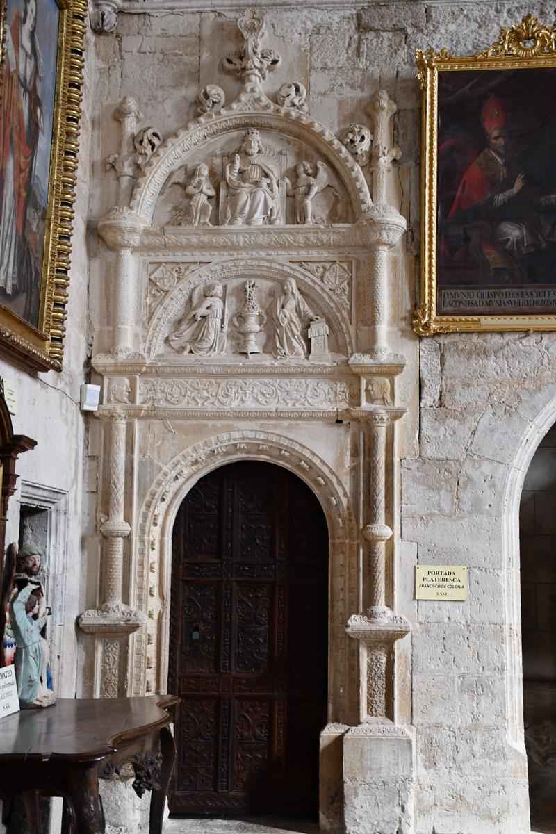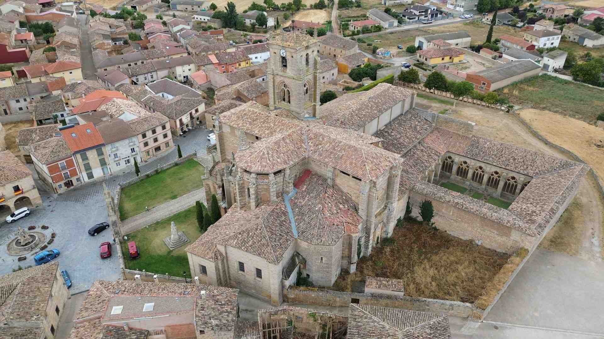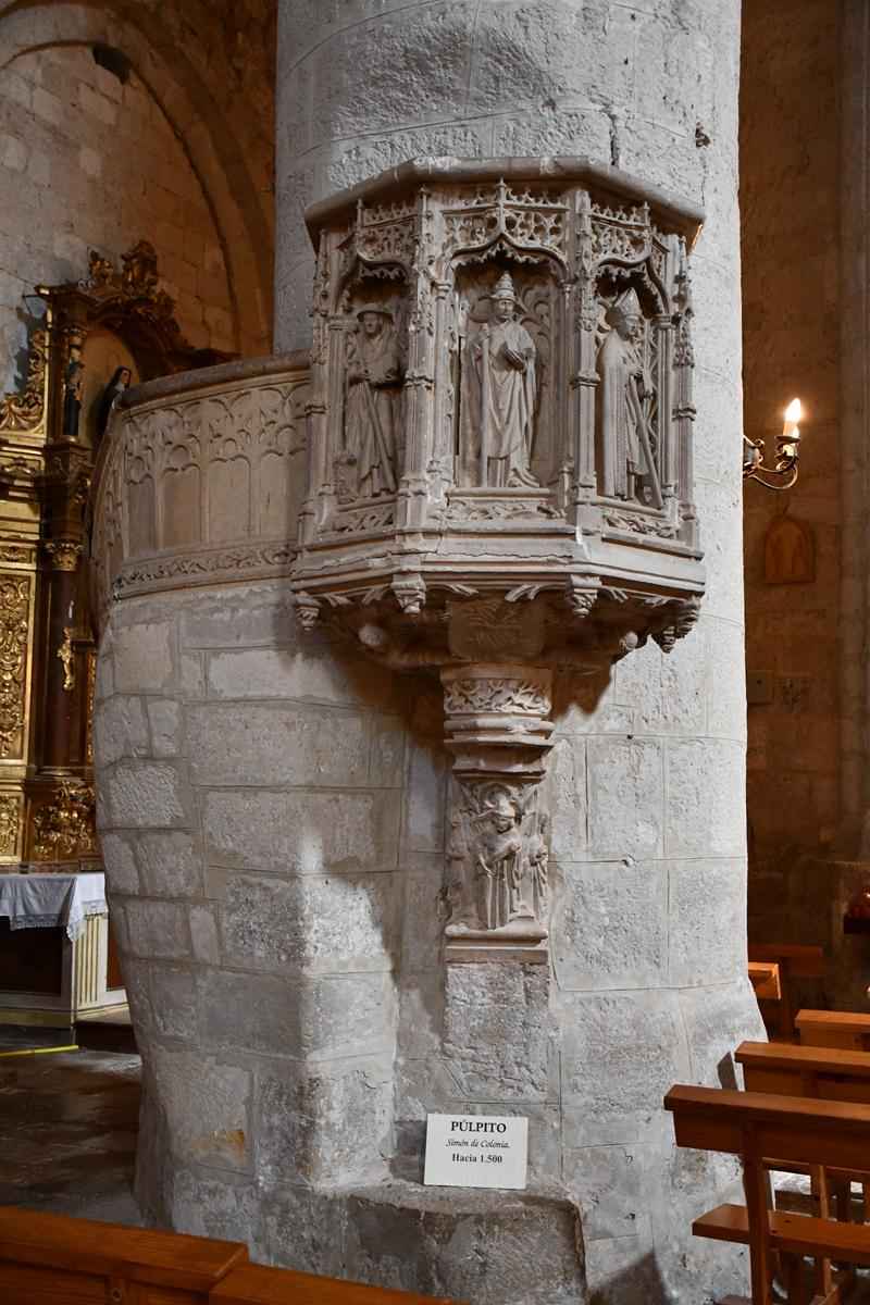 La planta del templo resulta extraña pues se compone de una gran nave central y dos laterales que fueron destruidas casi por completo durante la guerra de la Independencia, siendo separadas del resto de la iglesia por un muro. La cabecera es de grandes dimensiones y el crucero está compuesto por dos naves y posee cinco capillas. La torre se levanta en la cabecera de la nave sur. Del siglo XV es el claustro, situado en el lado norte, probablemente obra de Juan de Colonia. La magnífica puerta del brazo sur del crucero destaca por su semejanza con la puerta del Sarmental de la Catedral de Burgos. La sacristía, en la cabecera de la iglesia, es del siglo XVI.
